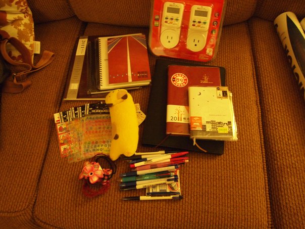 一些雜物。貓咪滑鼠塾在墾丁大街的攤販,文具在光南,髮飾在寶雅,定時插座在Costco買的。(咳)某些個人衛生用品,我還是比較喜歡亞洲的。棉棉在Costco和大潤發,面膜在寶雅和光南購買,竹炭肥皂(右上黑黑的那條)在鶯歌的某家店裡買的。粉餅與止汗劑購於中正機場免稅店。
