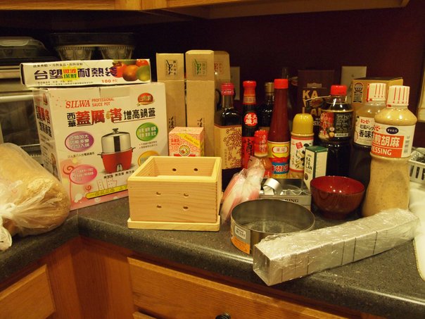 來噢!來大拜拜噢!這次回去搬最多的就是跟吃有關的。醋與桂圓薑湯-溪底遙(謝謝妹妹替我郵購);東泉辣椒醬-噗友Kate的愛心;大同醬油(大廠牌的黑豆醬油大概只剩這家我還沒有吃過,特別去找的)與搵醬-大潤發;枇杷膏,壽喜燒醬與其他日式醬料-Costco;河童燒酌-老爸的庫存;KaVaLan威士忌-Mr. Brown Coffee (對,咖啡店有賣威士忌,夠威吧);高帽子-鶯歌大賣場;耐熱袋,菜瓜布-老媽庫存;豆腐模-豆之味;慕絲模,鳳梨酥模-義興。吃的東西,不含包包就快超過25公斤,就不一一交代了。