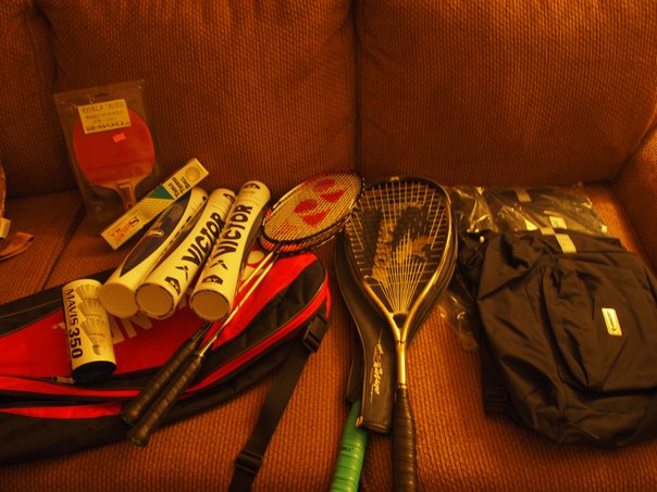 雖然美國是體育大國,可是運動用品在台灣便宜太多了!羽球組(球拍,塑膠球,球袋,護腕)與羽球三桶-Costco;迴力球拍,迴力球,桌球拍,羽毛球鞋-歐格;桌球-光南;腳踏車置物袋-捷安特。