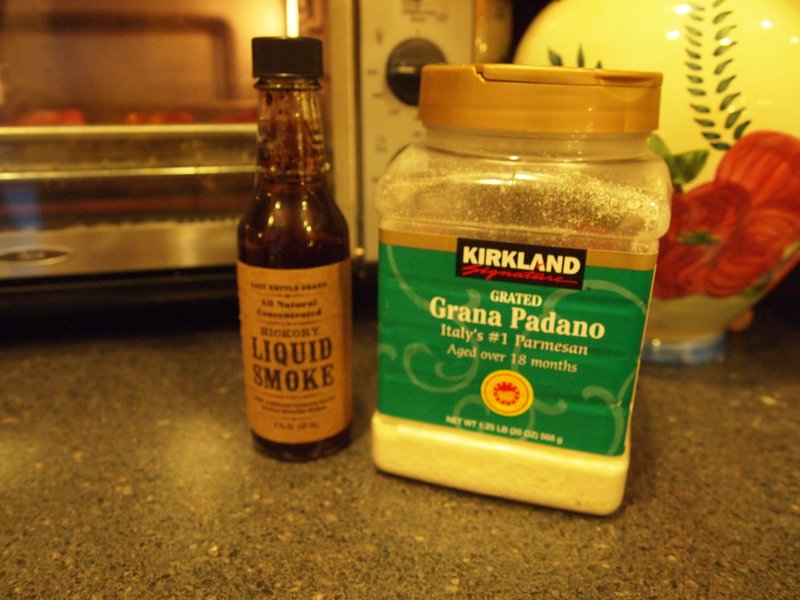 原來是用grill火烤的,我改成用烤箱,因為不想為了烤幾個蕃茄來開grill。但是grilled蕃茄比較乾,也有一個焦香味,所以我在烤箱蕃茄上滴了幾滴“煙味”。如果是剛好要烤牛排,那就一起全部送進grill裡!
